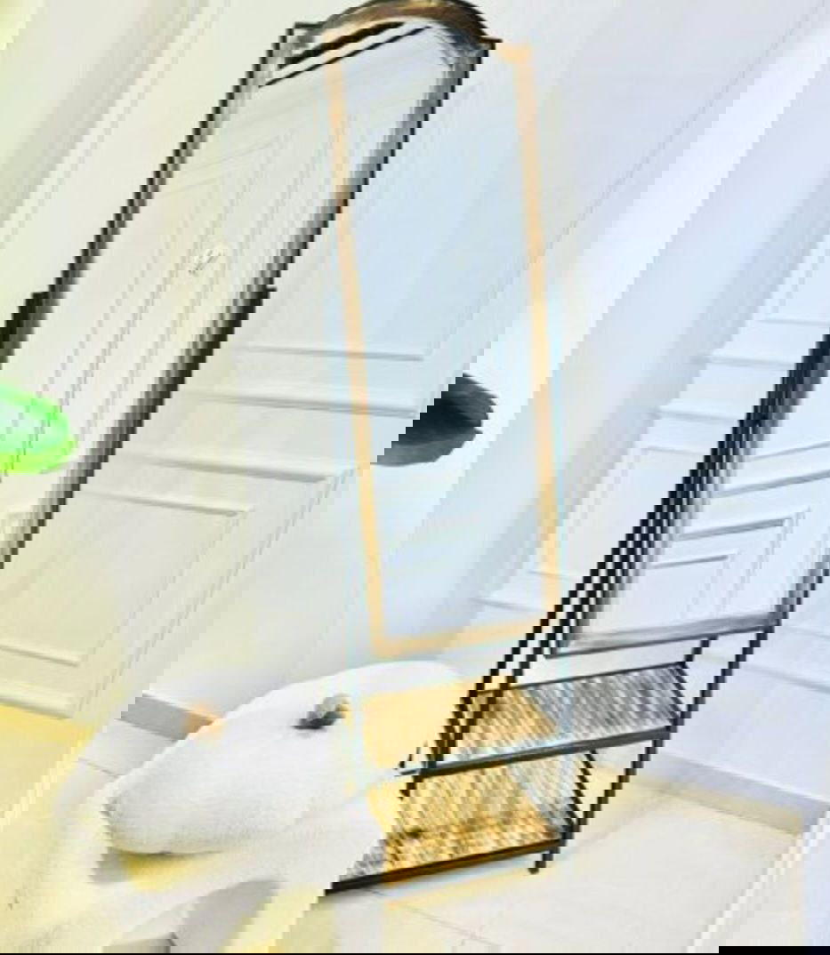 مرآة طويلة تعليق على حيط+معها علاقة للأرض توقيف بلون الأسود والذهبي تصميم راقي وجودة عالية.قياس 130*34  Preview Image
