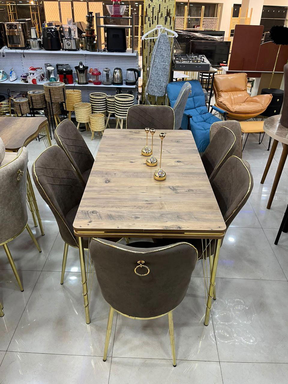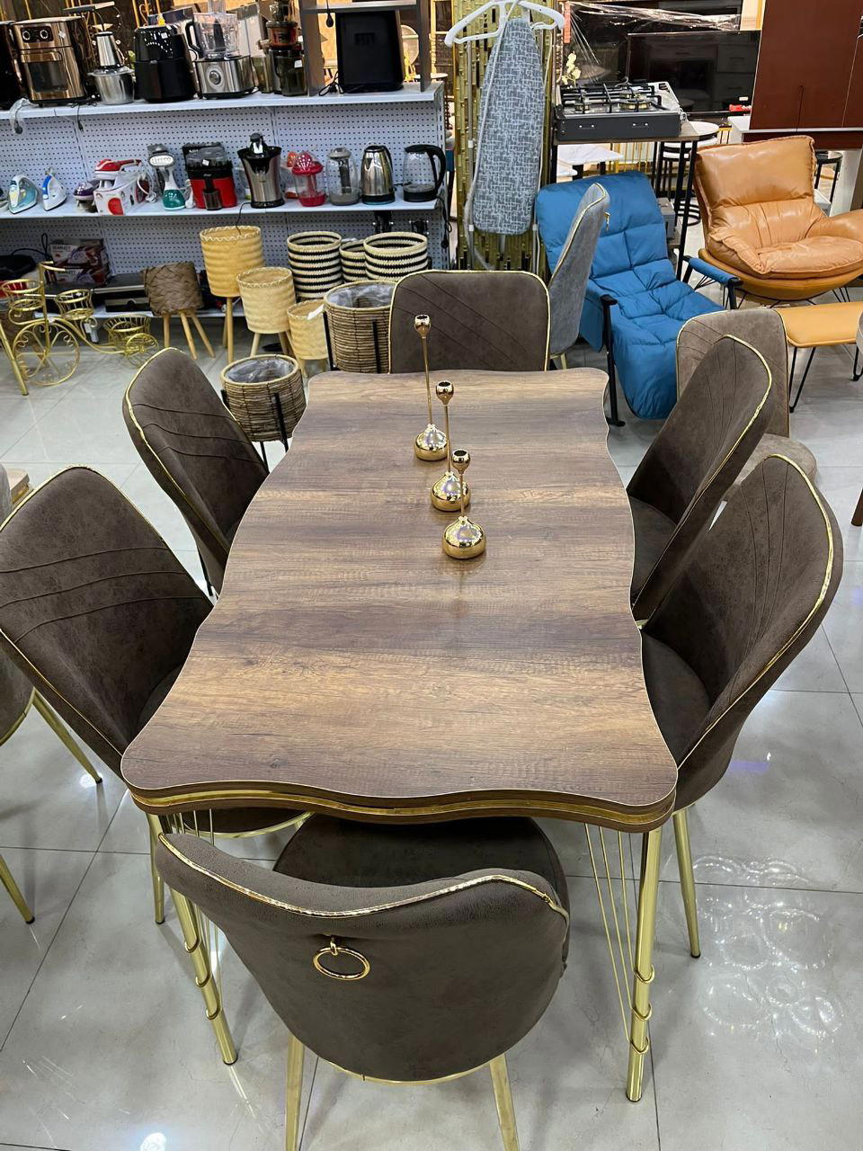 طاولات سفرة خشب تقيلمع 6 كراسي حديد ومقعد تنجيد